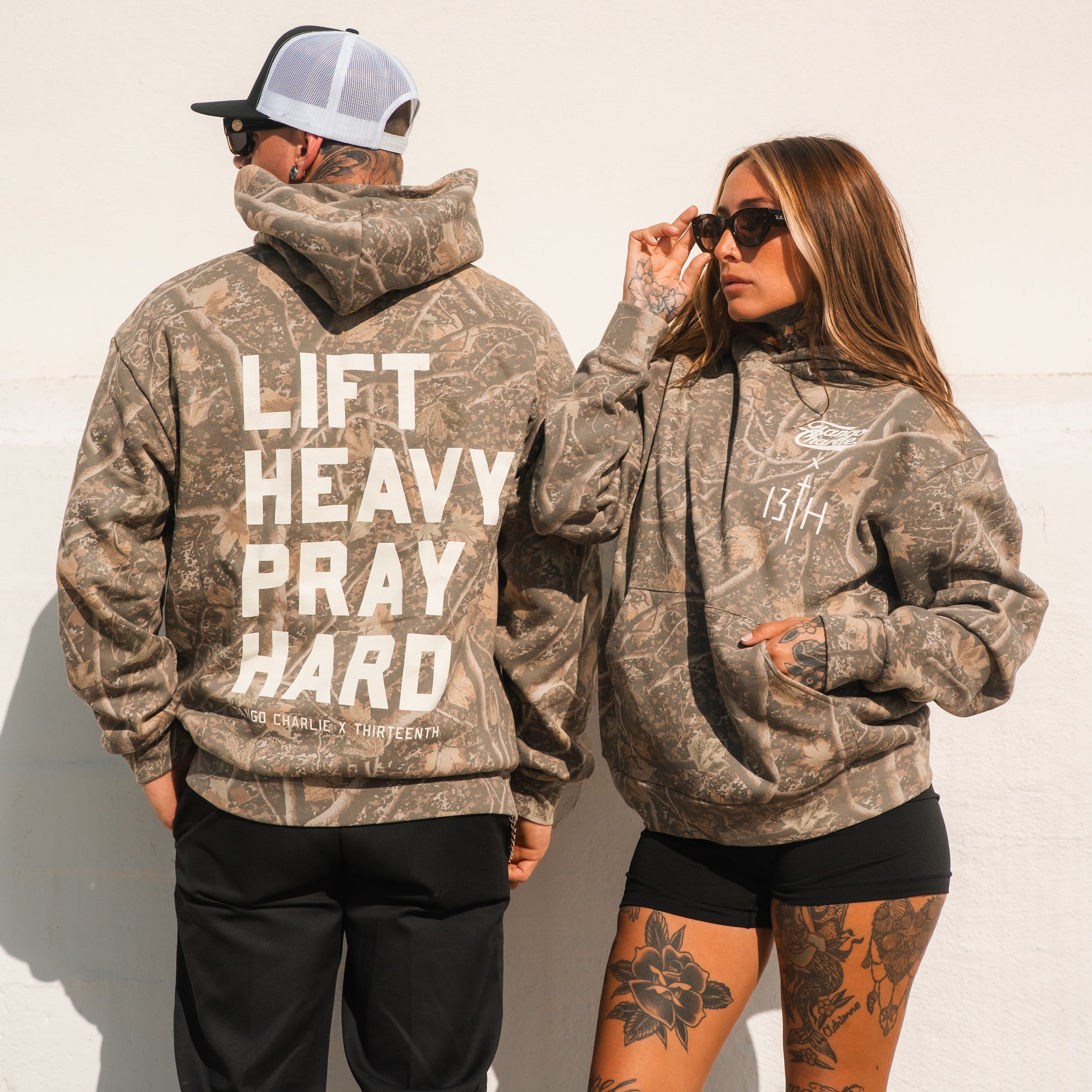 Lift Heavy. Pray Hard. - Premium Deadwood Camo Hoodie